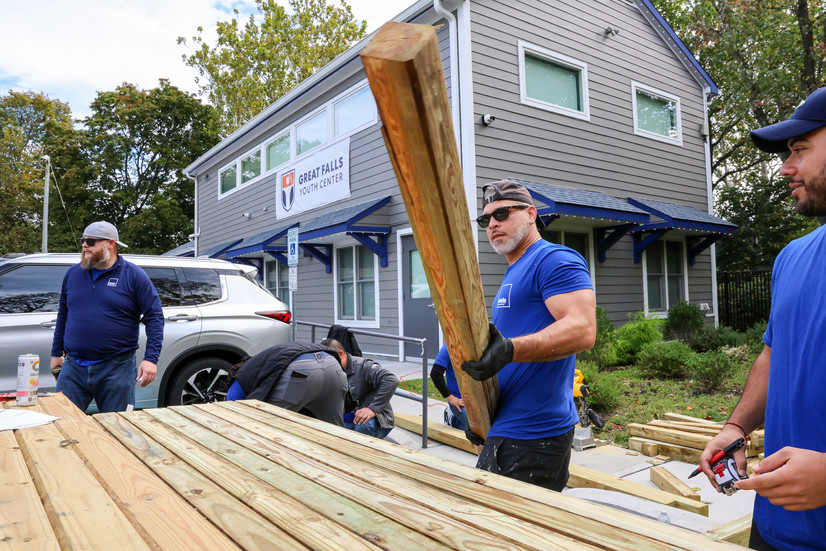 At our Great Falls Youth Center, volunteers spent the day sanding, painting, and sealing wooden benches; building and staining new planter boxes; planting flowers; and clearing litter and overgrown brush from the surrounding grounds. The transformation was immediate — what had been weathered and overgrown became bright and welcoming. It’s a space that deeply matters: hundreds of children attend youth arts classes, summer camp, and recreational programming there each year.
